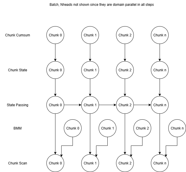 The State Passing step has dependencies between chunks, and the original State Passing kernel handled this by looping over chunks within threadblocks and splitting the state’s channels across threadblocks for parallelism. With this State Passing loop and the implicit global synchronization between kernel launches, all dependencies were handled in the original kernels.